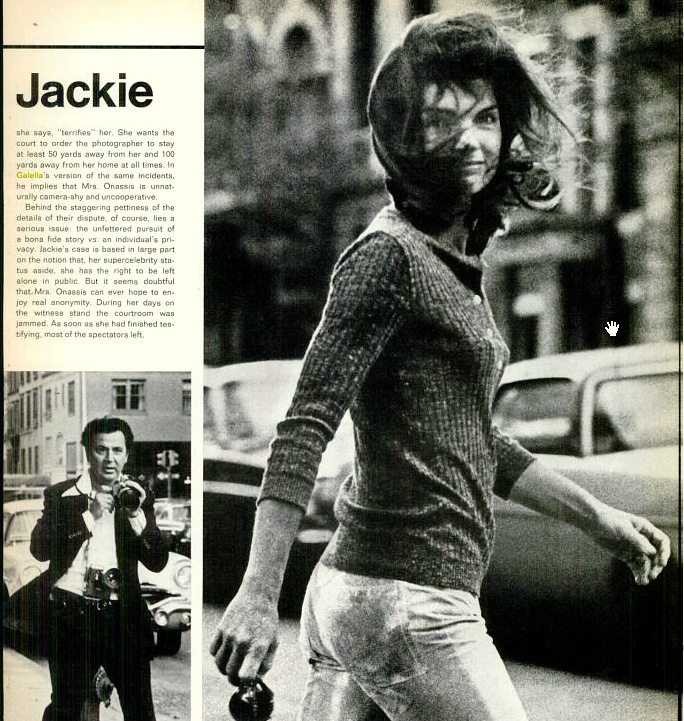 Galella is namelijk vooral bekend geworden als 'vaste stalker' van Jackie O. Nadat de voormalige presidentsvrouw van de VS in 1968 was hertrouwd met de Griekse zakenman Aristoteles Onassis, werd zij een gewild doelwit voor Galella. Zo bezeten was hij van Jackie dat hij maar liefst drie keer tegenover haar stond in de rechtbank. De eerste keer nadat hij haar had gefotografeerd in Central Park met haar zoon John Jr. Dat was 24 september 1969. Ik ging achter een boom staan en maakte twee goede foto's van John Jr. op zijn fiets. Toen ik achter de boom vandaan kwam, zag Jackie mij staan. Ze zei: Jij weer. Ze riep tegen haar bodyguard: sla zijn camera stuk! Ik rende naar de auto, de man rende achter me aan. Hij greep me vast en zei: geef me de film, of ze kraakt mijn ballen. Ik weigerde. Toen brachten ze me naar het politiebureau. Daar werd ik gearresteerd.