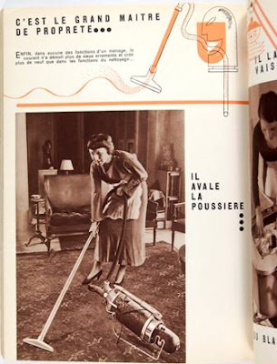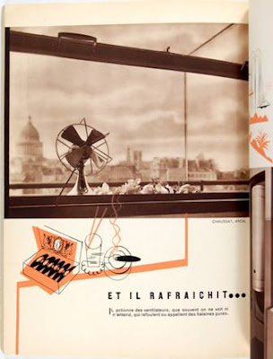 Ausserordentlich seltene kommerzielle Arbeit von André Kertész. Die 19 Photographien zeigen die  neuesten Errungenschaften der Elektrizitätswirtschaft: Hausfrauen bedienen abenteuerliche Staubsauger, Waschmaschinen usw. Typisch Kertész: ein Ventilator auf einem Fenstersims vor dem Panorame der Dächer von Paris. Interessante rot-schwarze Typographie, sogar das Erratum-Blatt ist typogrphisch durchgestylt.