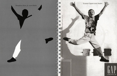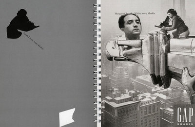 This extraordinary artist's book is a meticulously constructed succession of altered GAP clothing print advertisements from the 1990s that featured vintage, mostly 1940s-50s photographs of celebrities wearing khaki pants. One of Heinecken's most brilliant working methods--cutting out images from mass-media publications in order to reveal the complex layering and disintegration of meaning that occurs when the reader turns each page and can literally see beyond the surface--returns here in what amounts to a virtuoso artistic performance. As critic David Pagel writes in his essay The Gaps in the Ads: Robert Heinecken's Sabotaged GAP Ads, "Armed with only an X-Acto knife and stacks of GAP ads torn from everyday magazines, Heinecken hunkered down in a cramped little studio over a two-car garage in the Hollywood Hills and single-handedly turned a multi-million dollar advertising campaign on its ear...