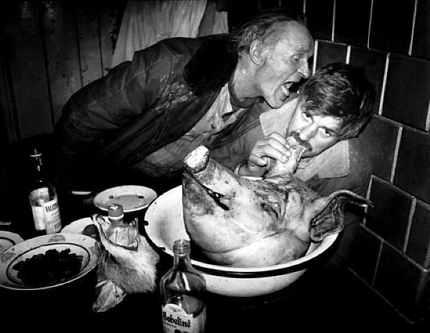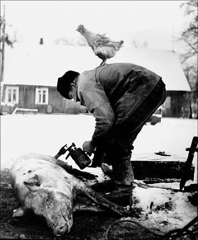 A farmer bends over a dead pig with a blowtorch, a chicken perched on his back. A young girl stares out of a window over the decapitated head of a goat. A drunk bites the ear of another drunk who is biting the ear of a pig's head on a plate. Welcome to the strange, frightening and darkly humorous world of Rimaldas Viksraitis, a 55-year-old photographer who travels through the benighted villages of his native Lithuania with a camera tied to his bicycle.