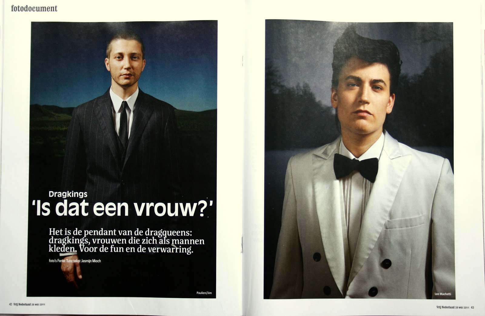 De mannen en vrouwen op de catwalk worden door het publiek toegejuicht terwijl confetti neerdwarrelt. De warme avond weerhoudt de deelnemers van de dragking/queen-verkiezing 2011 er niet van zich in lagen kleding te hullen - al dan niet van leer. Een slanke man met een baard van twee dagen draagt een goed gesneden kostuum en heeft een mooie vrouw aan de arm. Het is Jim Boh (33), jurylid en winnaar van de competitie van vorig jaar. Bezoeker Dave schudt zijn hoofd vol ongeloof: 'Is dat een vrouw?' Een vraag die de hele avond zal terugkeren. Jim heet in het dagelijks leven Paulien.