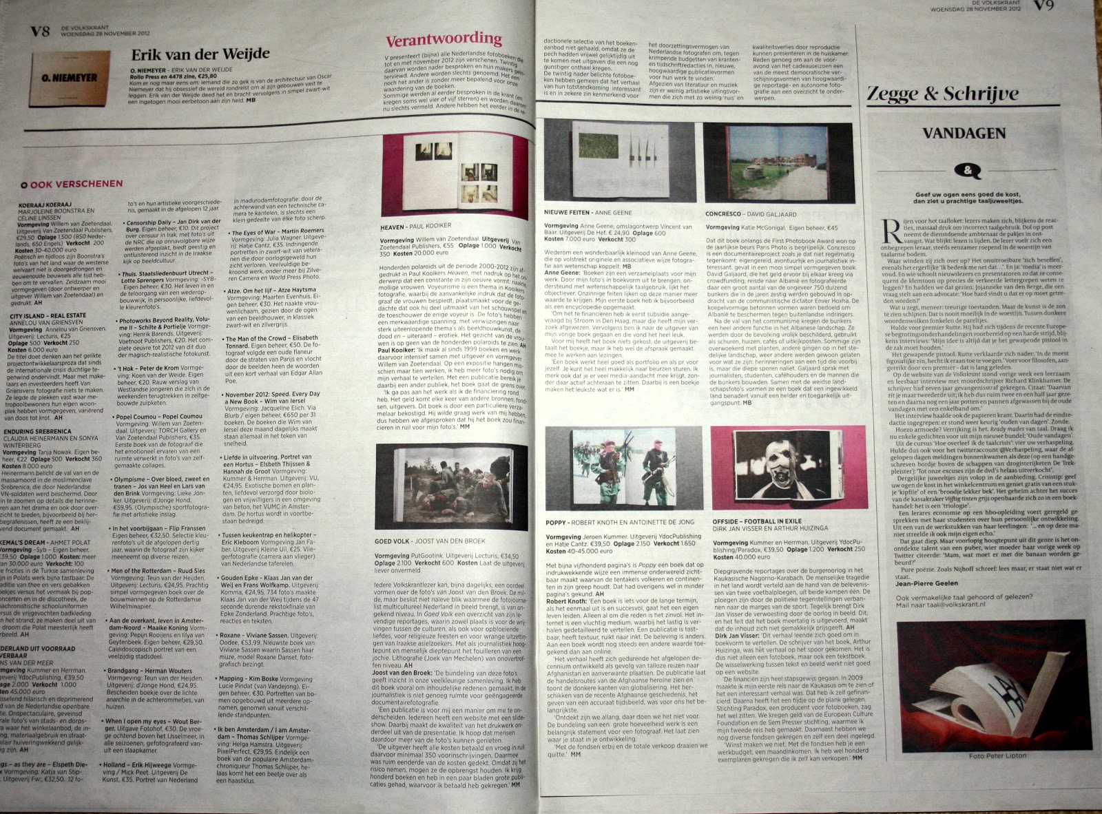 Het katern V van de Volkskrant pakt vandaag uit met een overzicht in acht pagina’s van de dit jaar tot nu toe verschenen fotoboeken. Een groot aantal wordt uitgelicht en voorzien van toelichting door de maker, waaronder ook oplages en productiekosten.