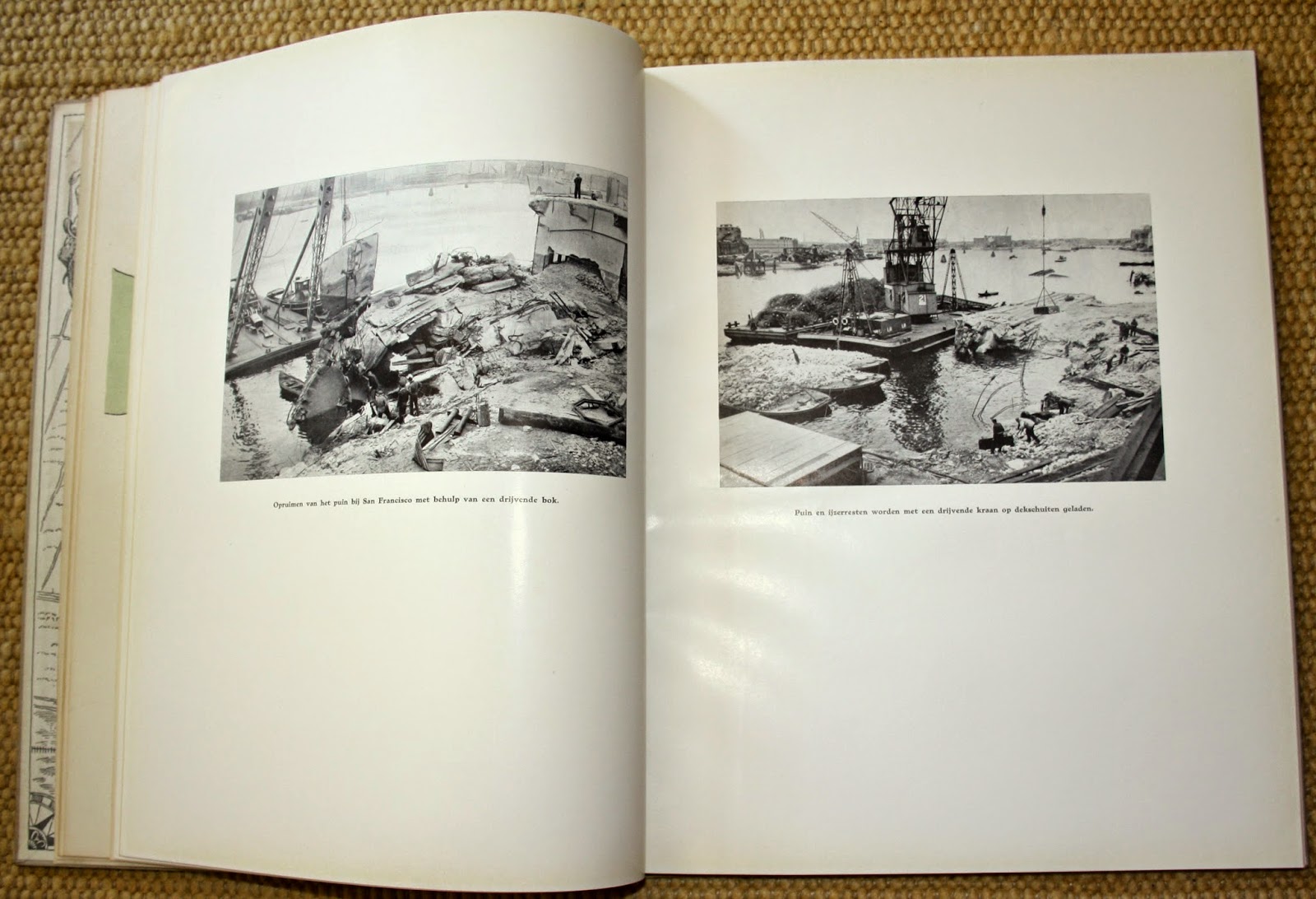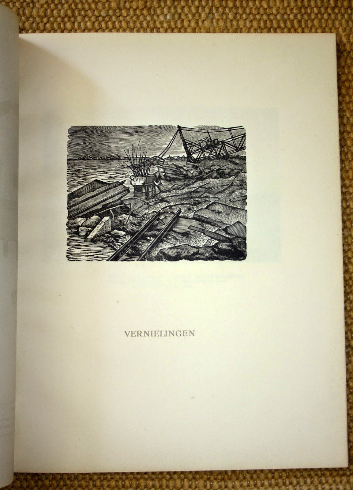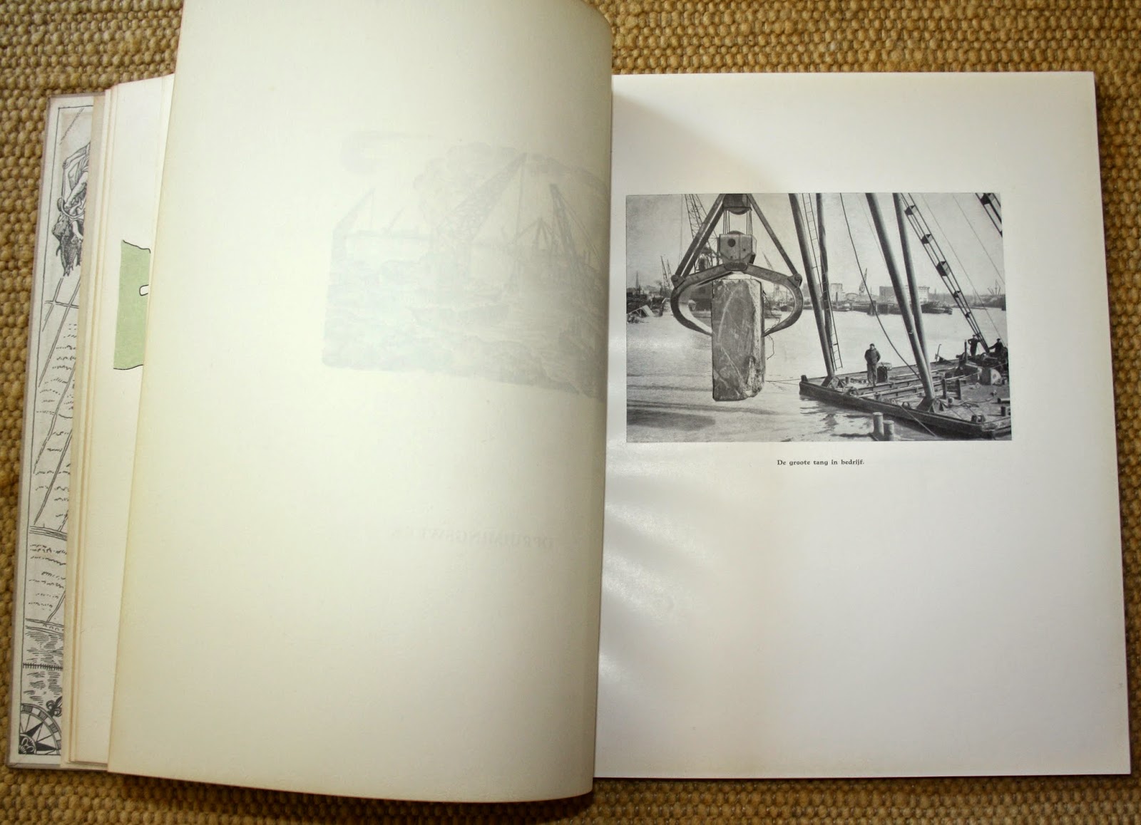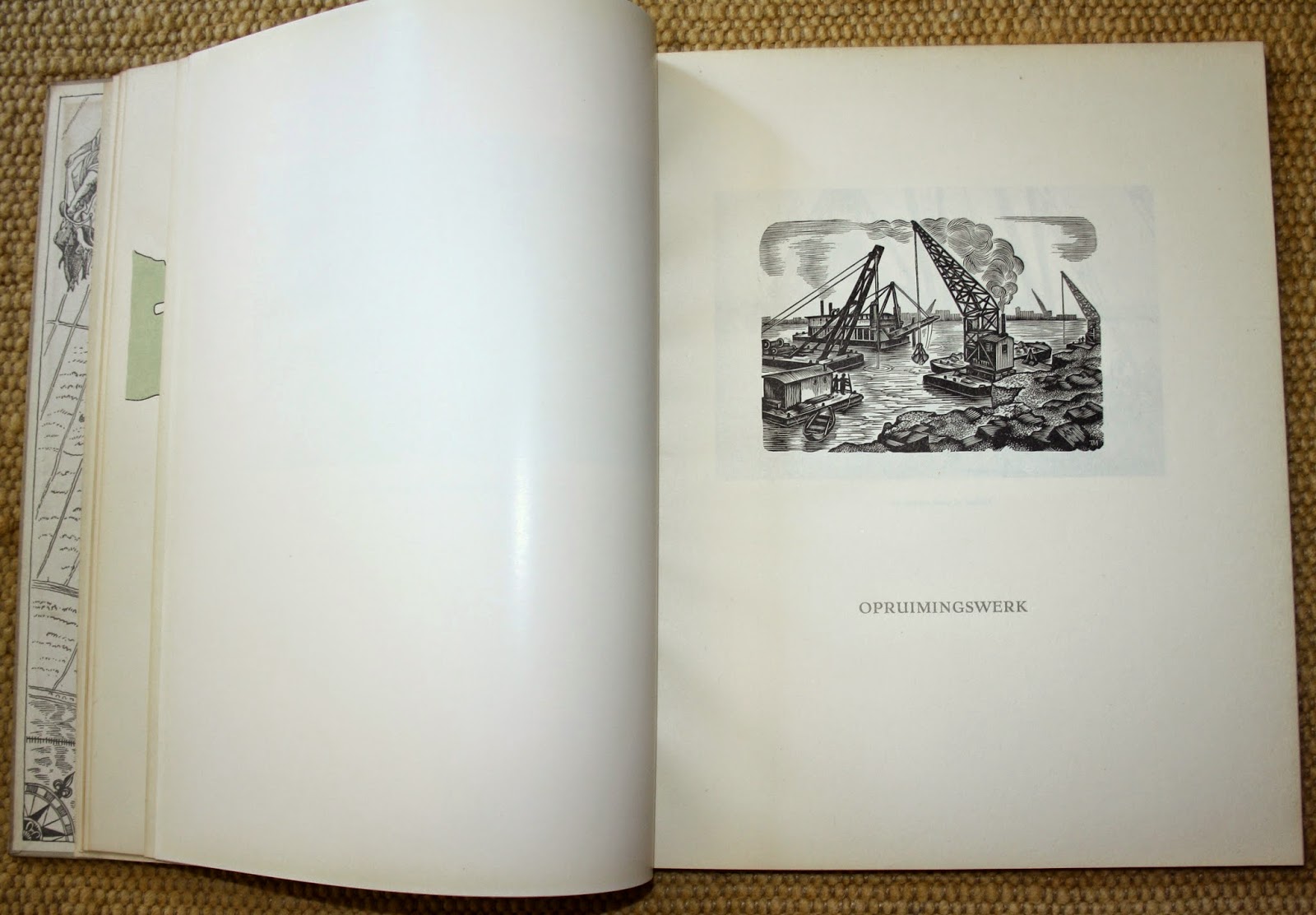 Rotterdam, Havenherstel Rotterdam. 1949, Eerste druk. Ongepagineerd. Met foto's van Jan Kamman te Rotterdam en illustraties van Thijs Mauve, die tevens de houtblokken voor de prenten en vignetten graveerde. Gebonden