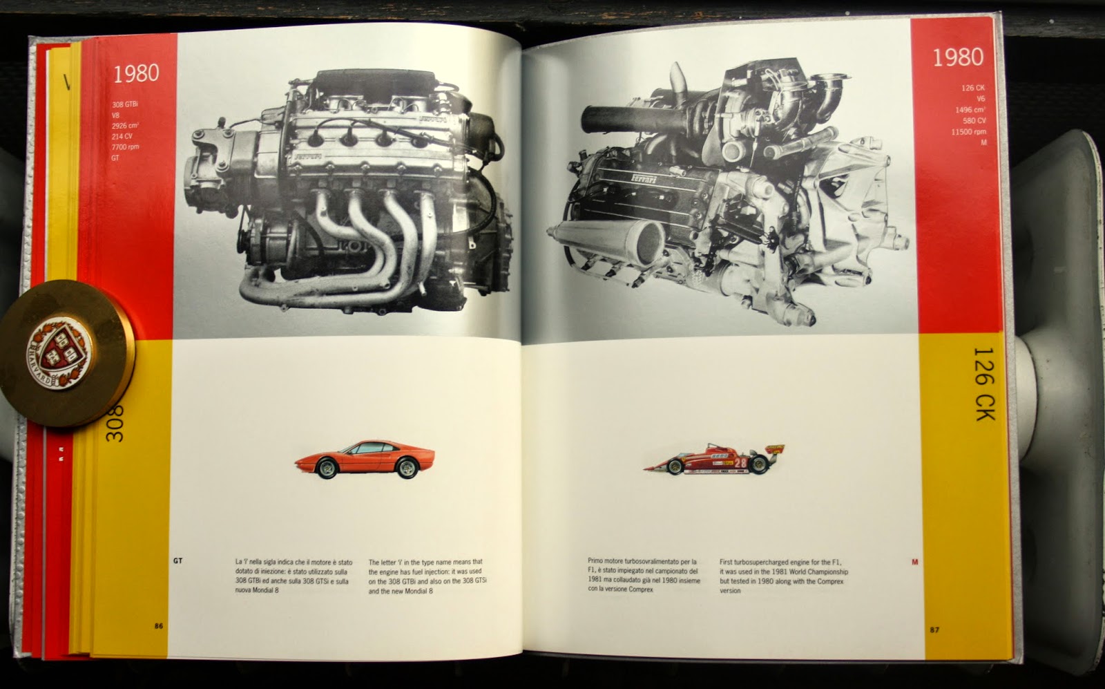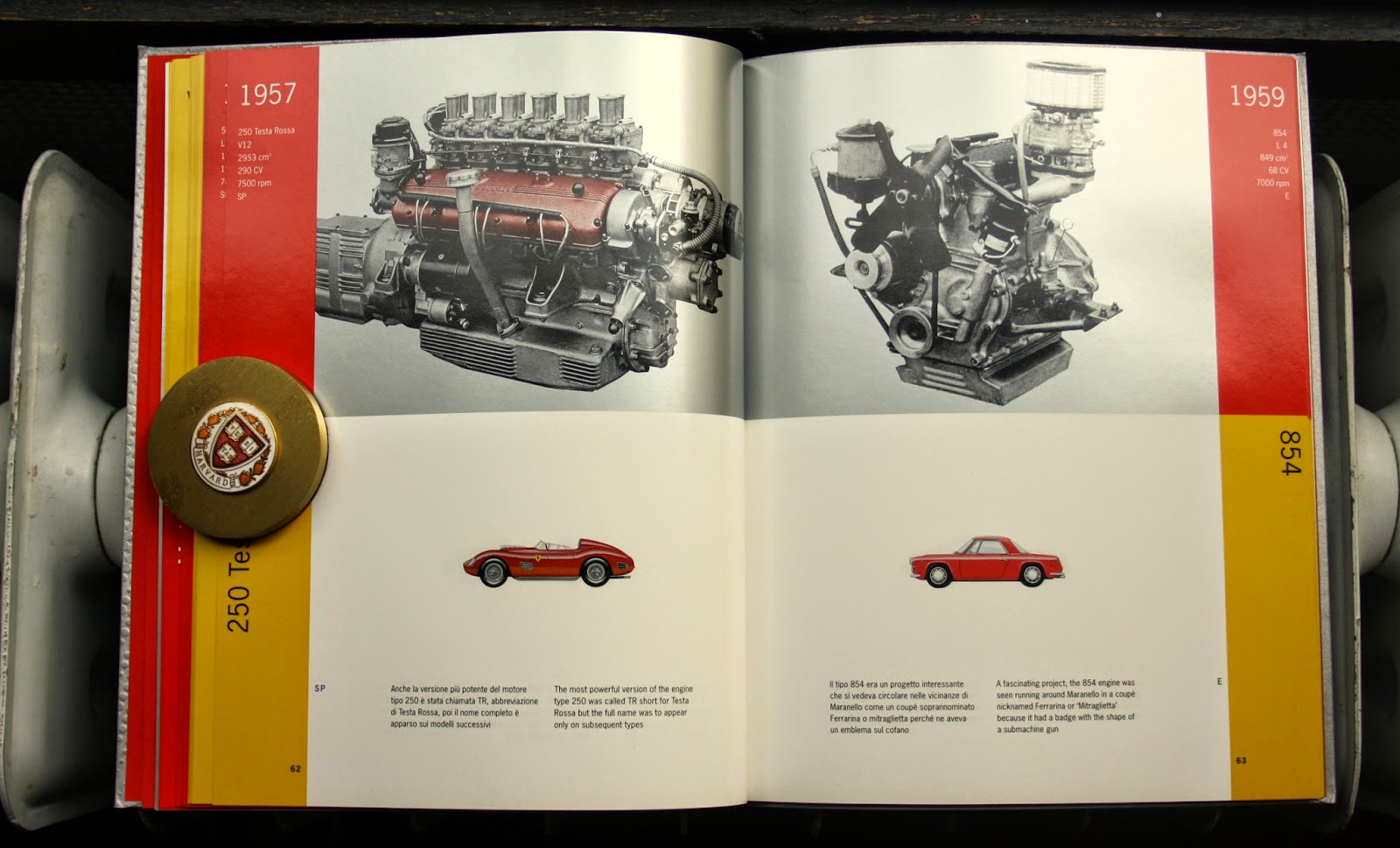 “Tutti i Motori Ferrari,” a catalogue of Ferrari engines designed by the Dutch graphic artist Irma Boom is also in MoMA’s design collection. Its soft, outer cover displays the Ferrari prancing horse logo on a silver-colored background that looks to be made of a fluid version of same the aluminum alloy used for F1 engine blocks; the interior plates showcase the evolution of the engines throughout Ferrari’s history. (A flip through of the pages of “Tutti I Motori Ferrari” begins at the one minute mark in the video “20 books by Irma Boom.”)