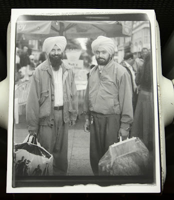 Man en vrouw met kinderen op de arm op de Albert Cuypmarkt. Portret van passanten, hoek van de Albert Cuypstraat en de Eerste Sweelinckstraat, gemaakt met een 20x24 inch Polaroid-camera. Foto uit de serie 'Polaroid Portraits'. Afmetingen 56x88 cm (inclusief witrand).This consciously shocking flirtation with feminine roles and attributes preceded the performances that he realized with Marina Abramovic between 1976 and 1988. The polarities which he had explored in himself were now investigated in real time and with a partner. Their subjects increasingly went beyond narcissistic, identity-related concerns, to concentrate on polarities such as culture and nature, body and spirit, quiescence and energy, art and life andindividuality and universality.