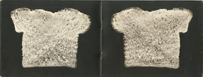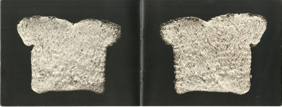 I have to admit that I had to struggle with The Bread Book when I first saw it. Its most significant aspect at first was the clever way in which the paradigm of subject and object had been retained. The book not only duplicated a loaf of bread, but any loaf of bread now became a model for The Bread Book. That is the sort of thing that makes Siskind's photograph of a discarded glove work in the same way that a photograph of a shoe woulddn't work -- for gloves, or hands, exist in the vertical, but a shoe on the wall would have been an absurdity.