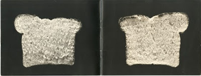The Bread Book by Kenneth Josephson (1973) is a small booklet of twenty pages printed in offset. Starting with the front cover, which shows, besides the title, the cap of a loaf of bread. Each sheet progressively shows the front and back of all ten slices of a small loaf of bread. The back cover therefore shows the other end of the loaf.