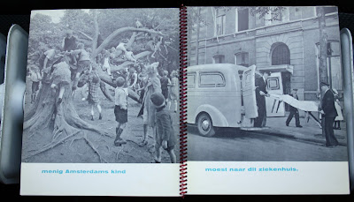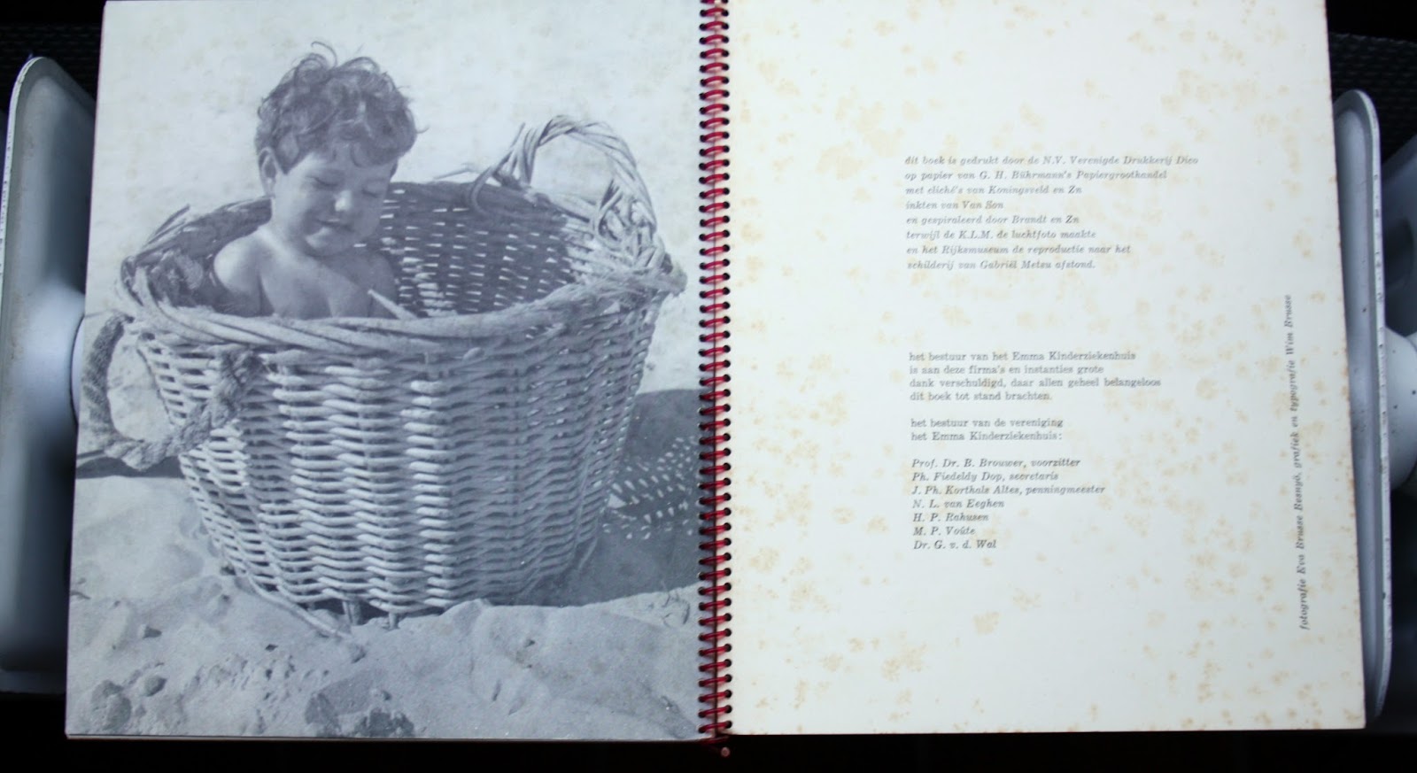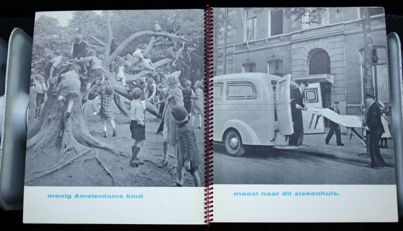 Zonder plaats (Amsterdam), gedrukt door N.V. Verenigde Drukkerij Dico voor het Emma Kinderziekenhuis, z.d. (ca. 1950), (24) p., met 20 fotografische illustraties van Eva Brusse Besnyö en typografie van haar man Wim Brusse, enkele andere illustraties, oorspronkelijk spiraalgebonden omslag door Brandt en Zoon, 25,5 x 22 cm.