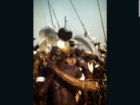 Pictured: Latuka dance of the rainmakers, 1948. A warrior sounds the native horn called the namogo, which is the end of an elephant's tusk covered with the uncut stretched skin of an ox tail.