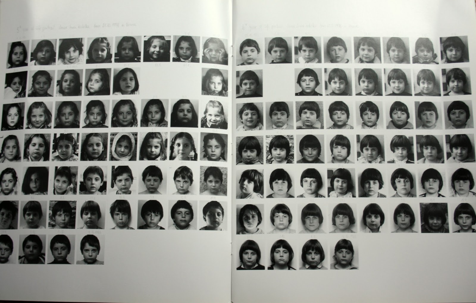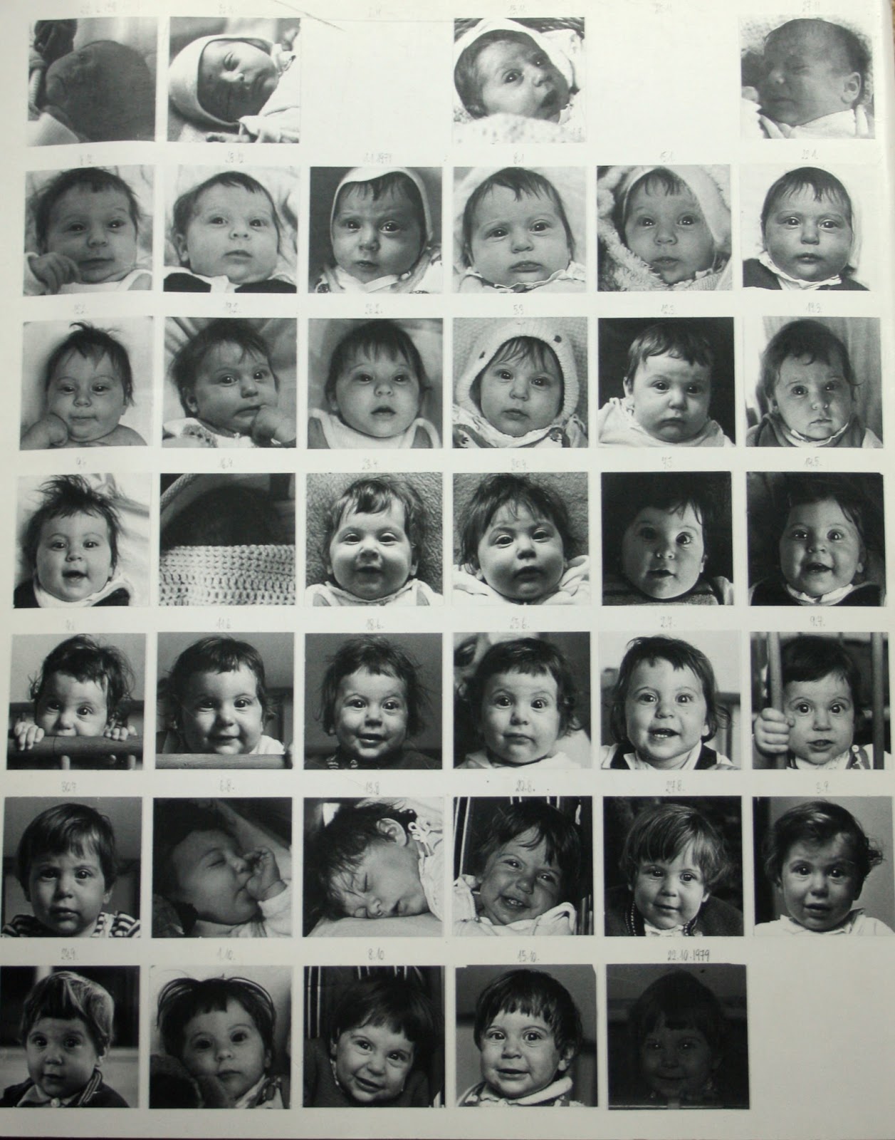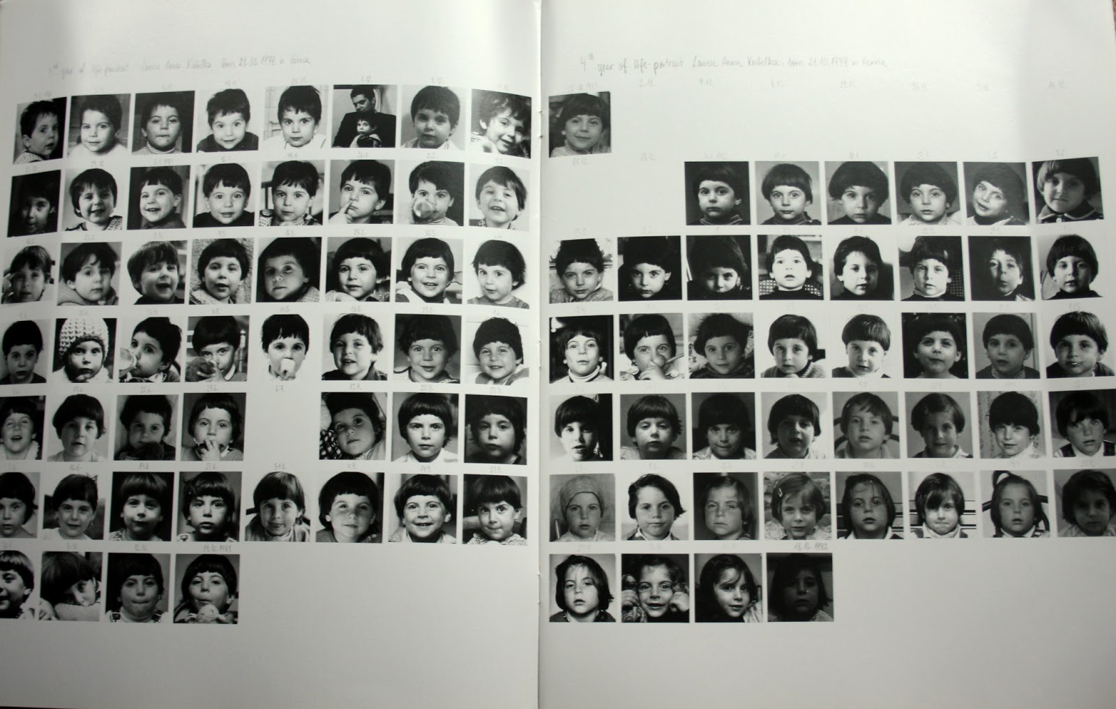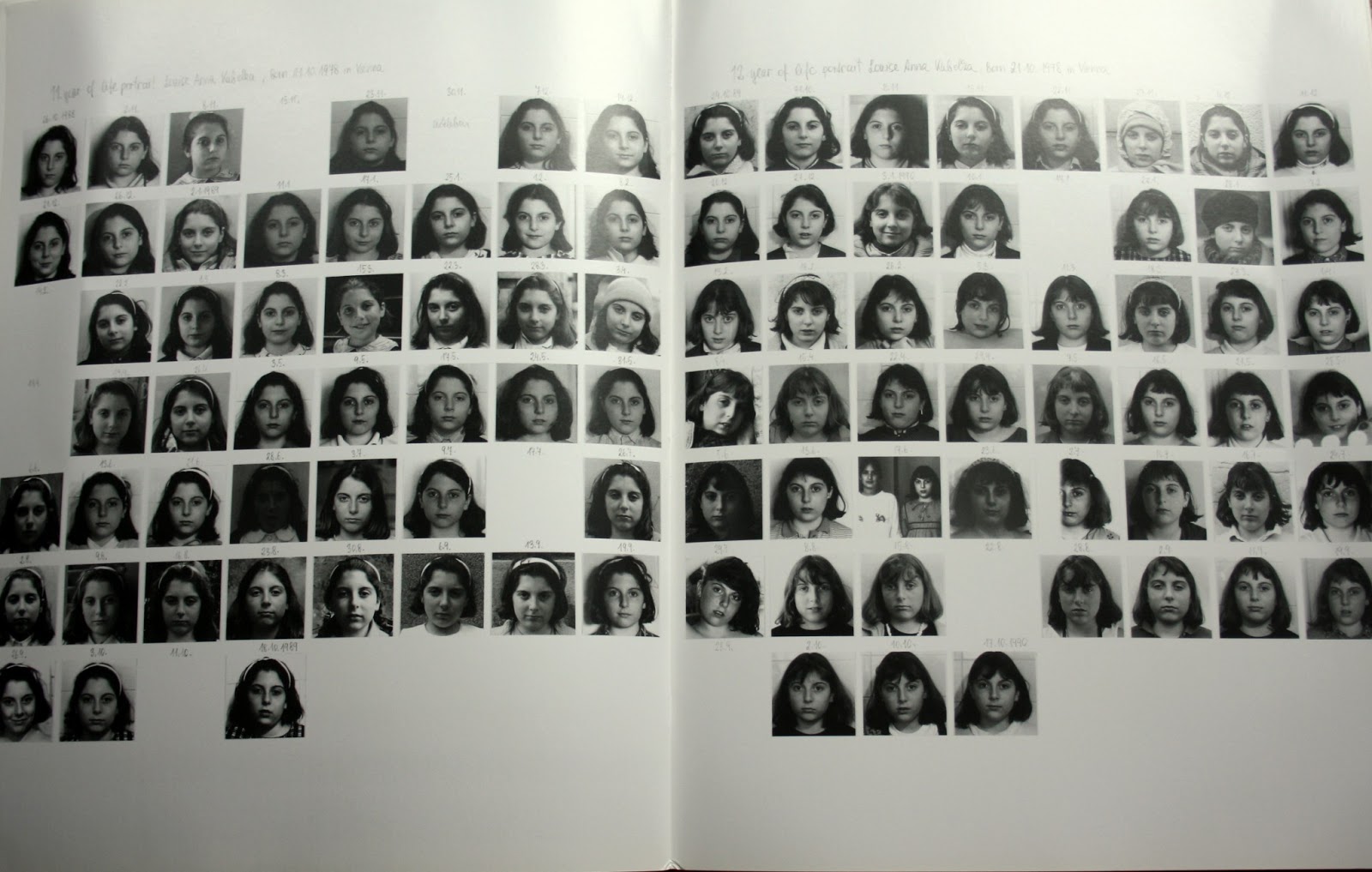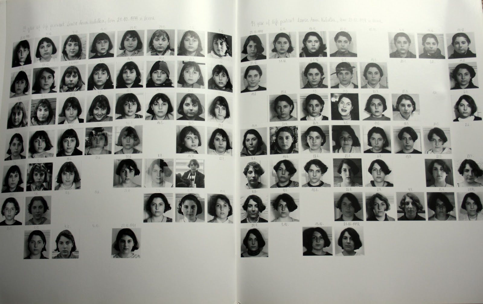 By 9 or 10 Louise seems to be shaping her own identity and self-representation apart from her mother. Her hair styles vary and blank spaces appear in the grids where a Monday photo was missed. By the last year, the 18th, only 12 images appear in the first few months until finally the ritual is broken.